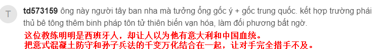 还有很多人直夸中国队主帅太厉害了。有人给出很高的评价:这位教练明明是西班牙人,却让人怀疑他有意大利和中国血统,他把意式混凝土防守和孙子兵法的千变万化融合在一起,让对手完全措不及防(下图)。